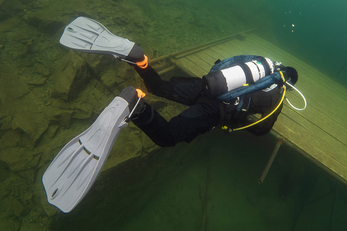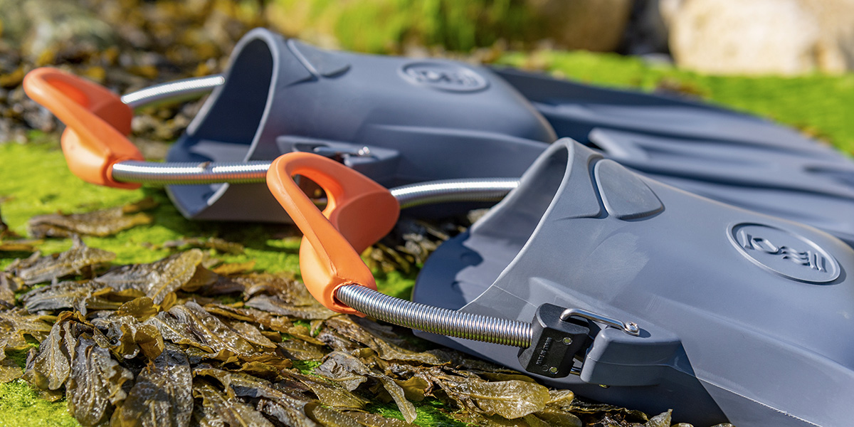 "The fin blades feature a wide, almost stubby paddle design which delivers the stability and manoeuvrability that tech divers love, allowing for precise control of the fin through the ankle."